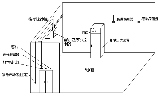 如在噴放延時(shí)過程中發(fā)現(xiàn)不需要啟動(dòng)滅火裝置,可按下防護(hù)區(qū)外或控制器上的“緊急停止”按鈕,終止滅火指令。