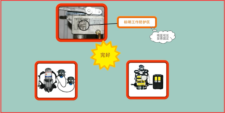 4、防護區(qū)外專用的空氣呼吸器或氧氣呼吸器是否完好;