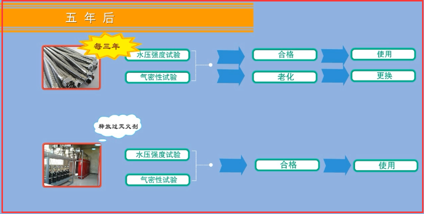 2、五年后,對釋放過滅火劑的儲瓶、相關閥門等部件進行一次水壓強度和氣體密封性試驗,試驗合格方可繼續(xù)使用。