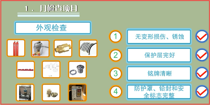 ①滅火劑儲存容器及容器閥、單向閥、連接管、集流管、安全泄放裝置、選擇閥、閥驅動裝置、噴嘴、信號反饋裝置、檢漏裝置、減壓裝置等全部系統(tǒng)組件應無碰撞變形及其他機械性損傷,表面應無銹蝕,保護涂層應完好,銘牌和保護對象標志牌應清晰,手動操作裝置的防護罩、鉛封和安全標志應完整;
