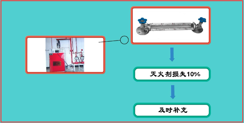 (1)對低壓二氧化碳滅火系統(tǒng)儲存裝置的液位計進行檢查,滅火劑損失10%時應及時補充。
